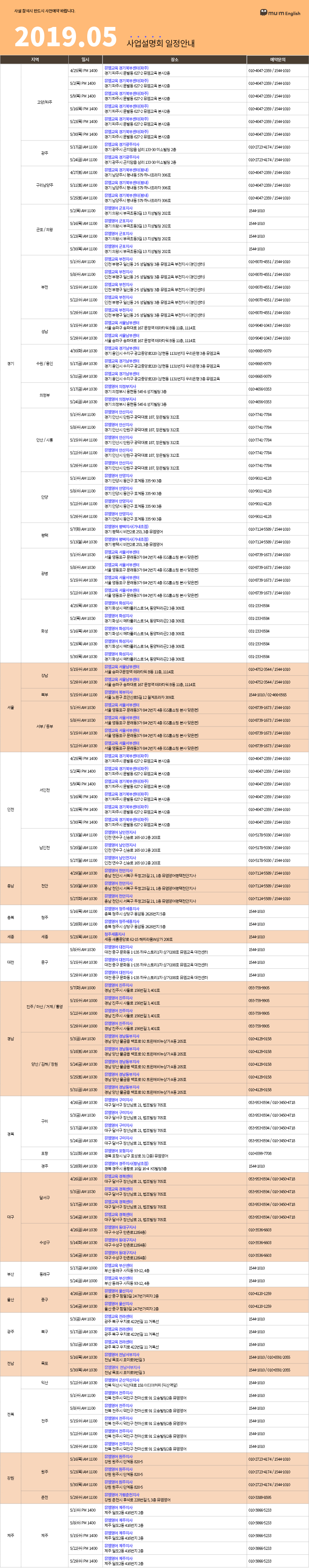 | 초등영어 대표 프랜차이즈 뮤엠영어의 19년 04월 사업설명회 일정표 (0) | 2019.03.26 |