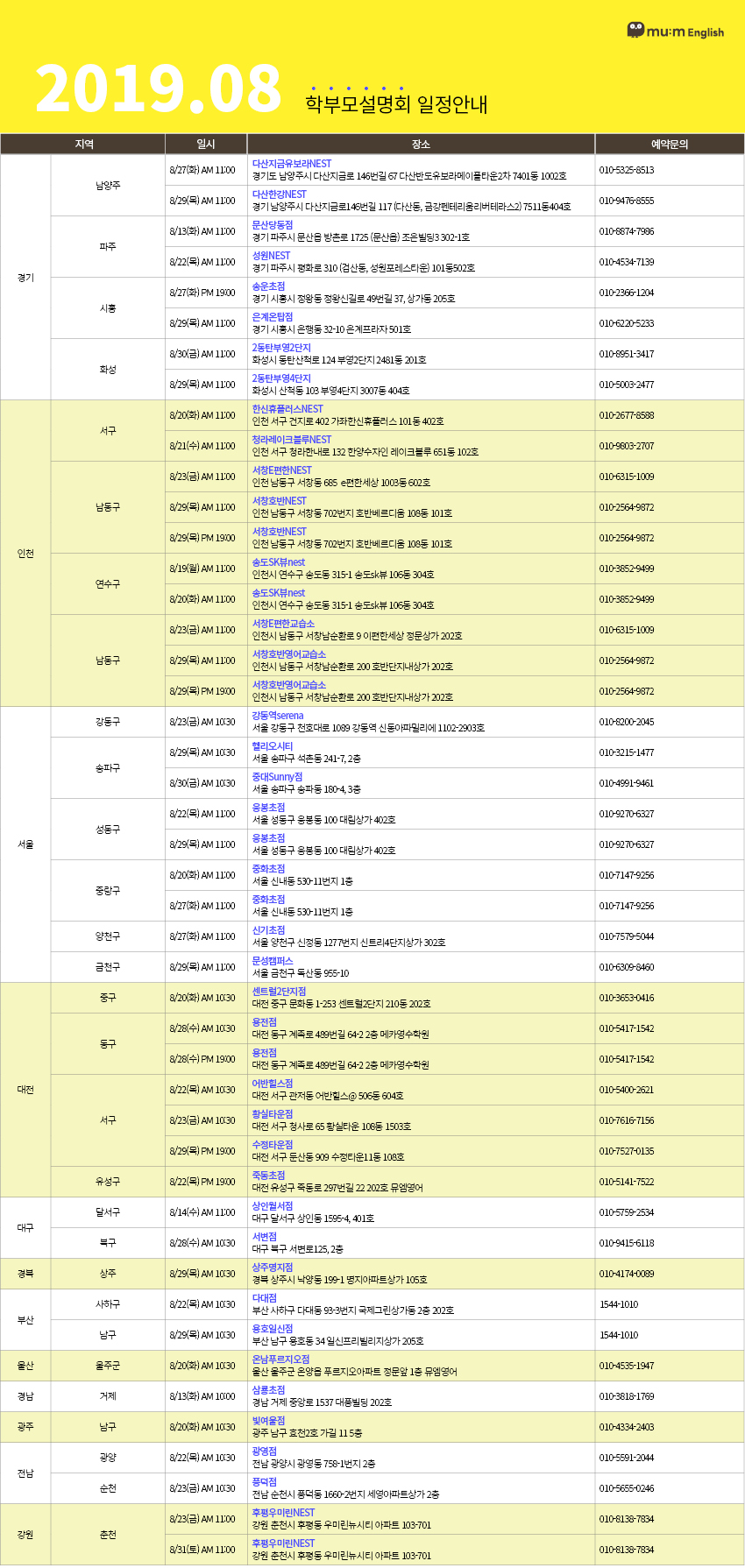 초등영어 대표 프랜차이즈 뮤엠영어의 19년 08월 학부모설명회 일정표