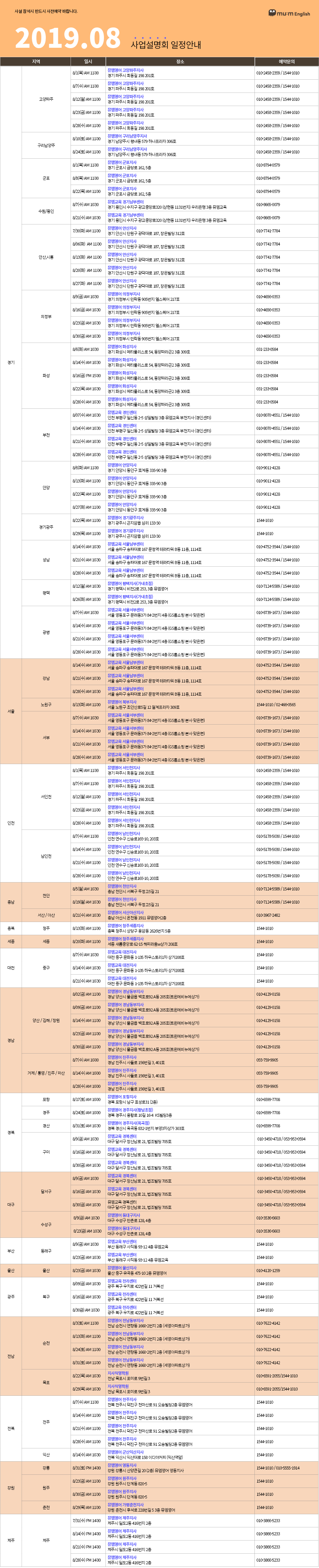 초등영어 대표 프랜차이즈 뮤엠영어의 19년 08월 사업설명회 일정표