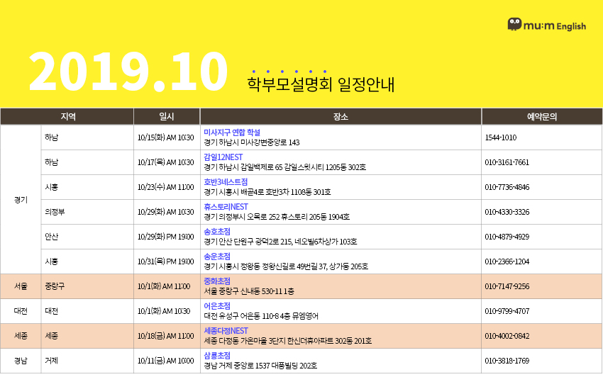 | 초등영어 대표 프랜차이즈 뮤엠영어의 19년 10월 사업설명회 일정표 (0) | 2019.09.25 |
