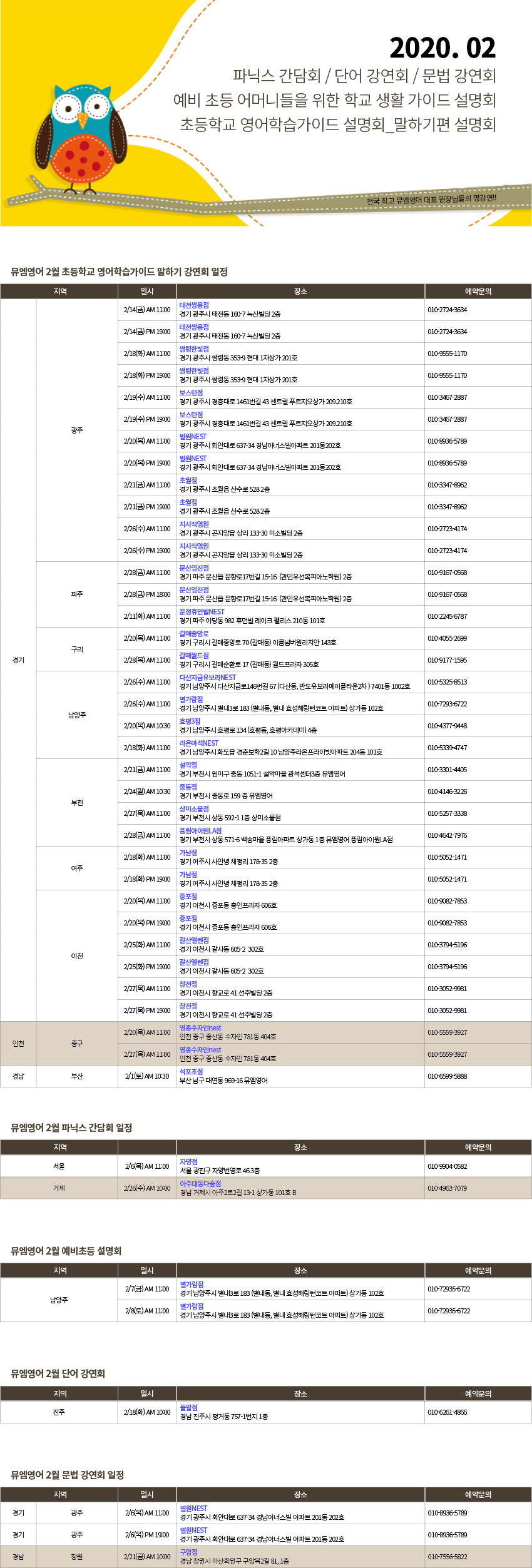 | 초등영어 대표 프랜차이즈 뮤엠영어의 20년 2월 학부모설명회 일정표 (2) | 2020.01.23 |