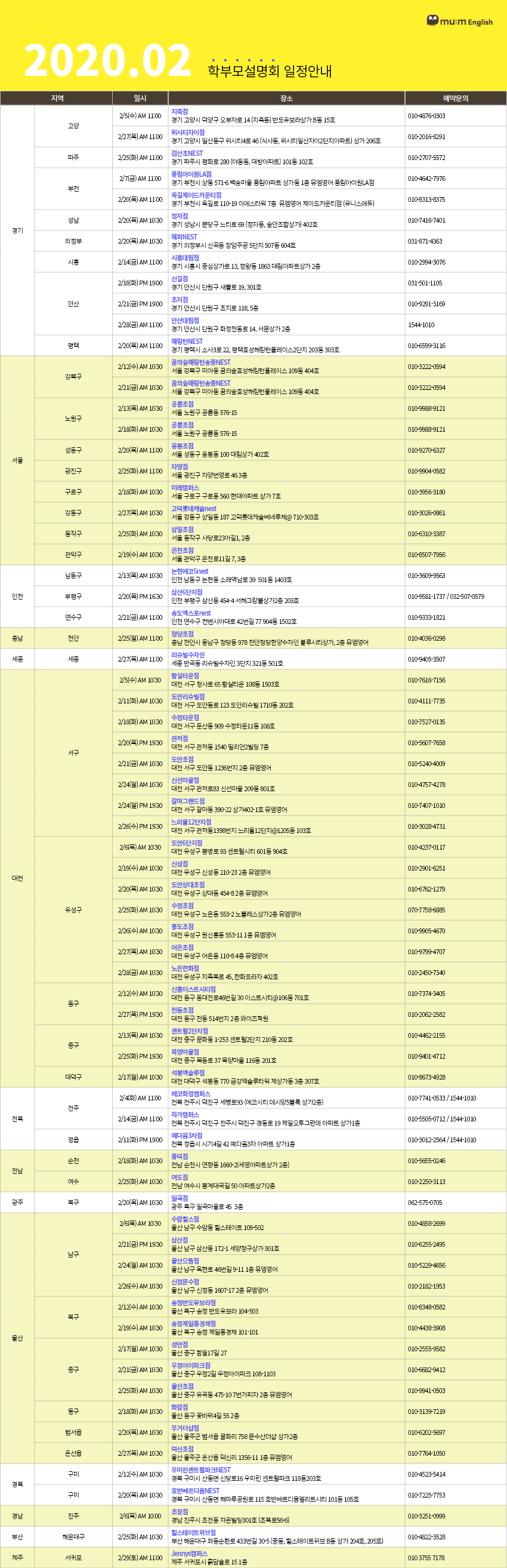 초등영어 대표 프랜차이즈 뮤엠영어의 20년 3월 학부모설명회 일정표 (2) | 2020.02.27 |