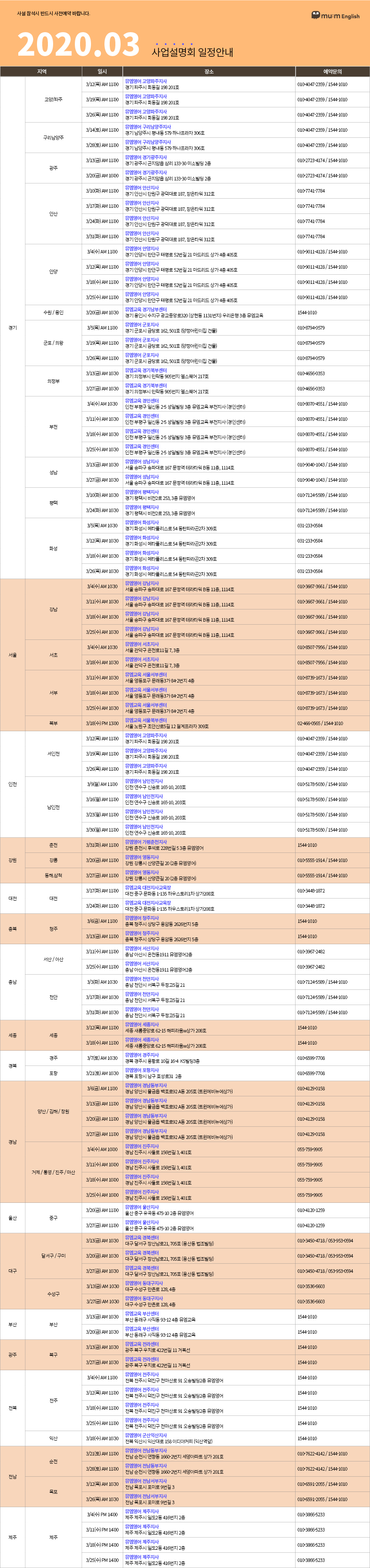 | 초등영어 대표 프랜차이즈 뮤엠영어의 20년 3월 학부모설명회 일정표 (2) | 2020.02.27 |