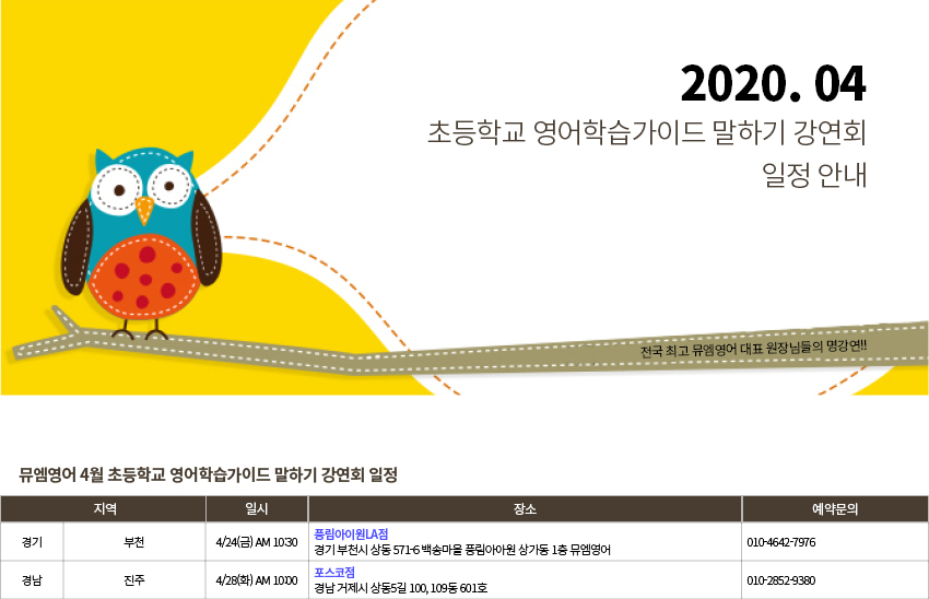 초등영어 대표 프랜차이즈 뮤엠영어의 20년 3월 스피킹강연 일정표 (4) | 2020.02.27 |