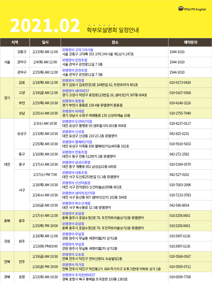 | 초등영어 대표 프랜차이즈 뮤엠영어의 21년 2월 사업설명회 일정표 (4) | 2021.01.26 |
