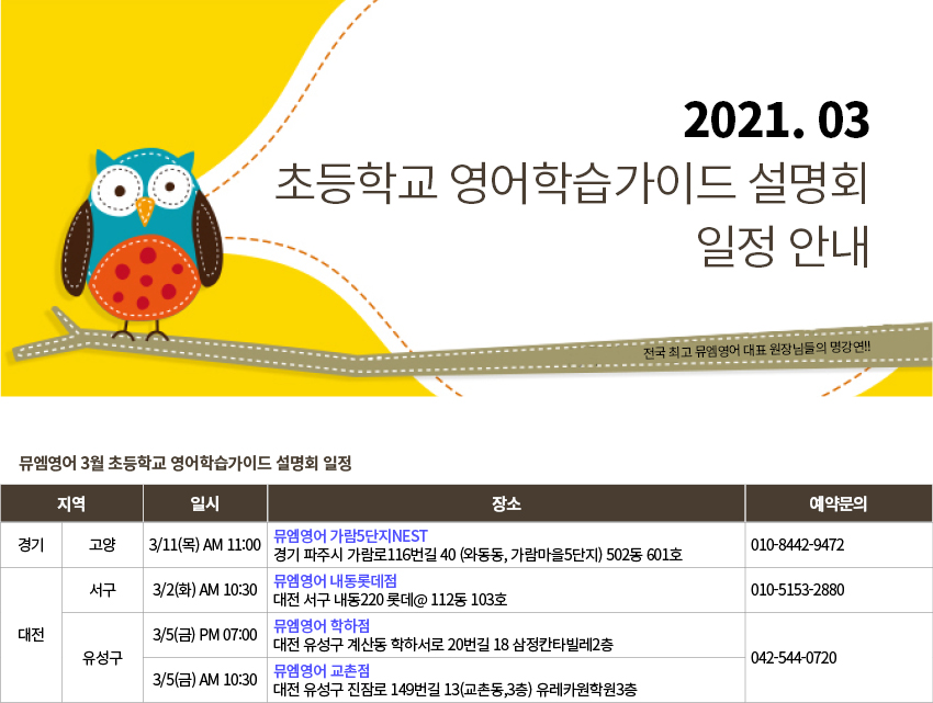| 초등영어 대표 프랜차이즈 뮤엠영어의 21년 3월 사업설명회 일정 (4) | 2021.03.02 |