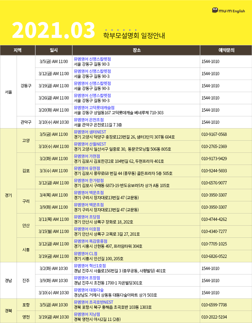 | 초등영어 대표 프랜차이즈 뮤엠영어의 21년 3월 사업설명회 일정 (4) | 2021.03.02 |