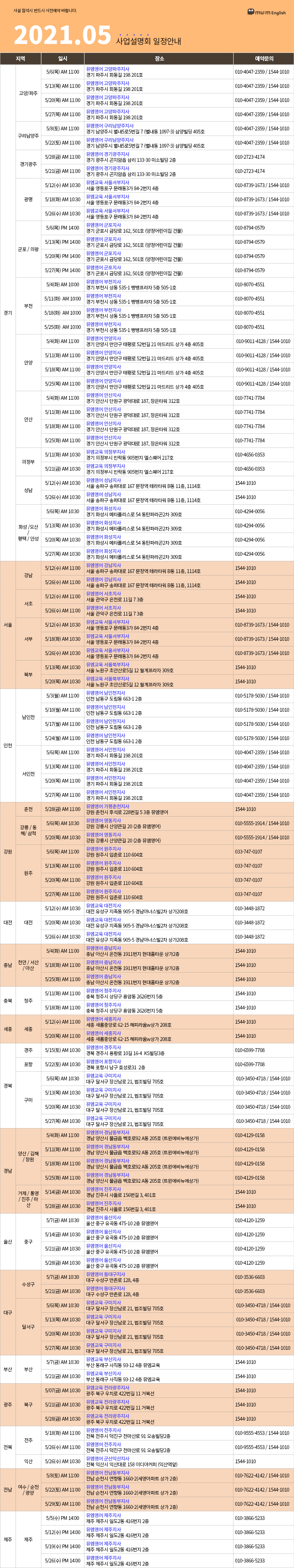 | 초등영어 대표 프랜 차이즈 뮤엠영어의 21년 5월 학부모설명회 일정 (2) | 2021.04.28 |