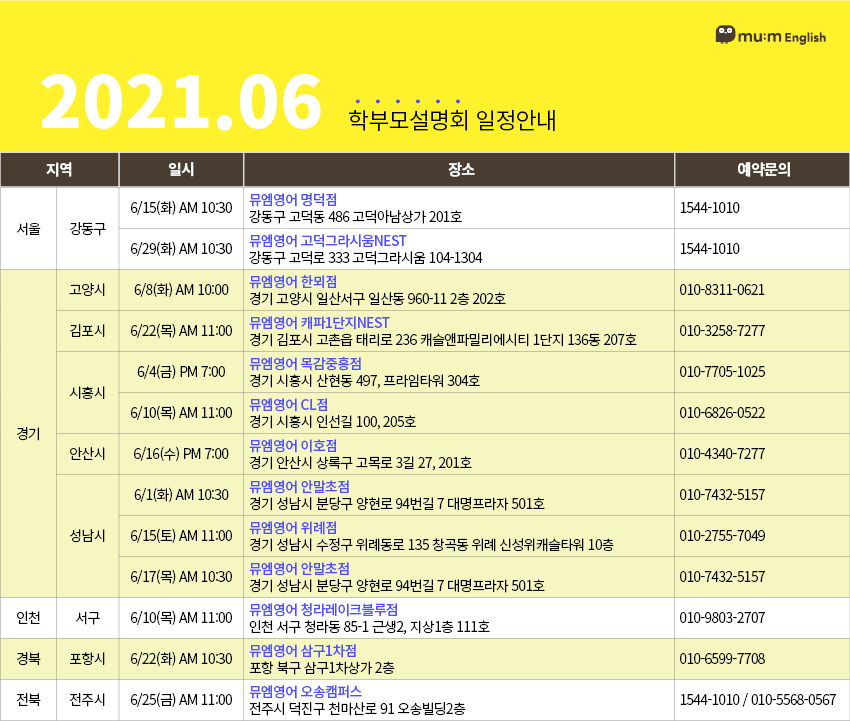 | 초등영어 대표 프랜 차이즈 뮤엠영어의 21년 7월 학부모설명회 일정 (2) | 2021.06.24 |