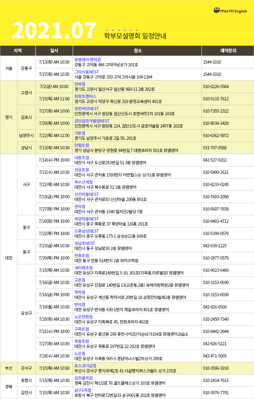 | 초등영어 대표 프랜 차이즈 뮤엠영어의 21년 5월 학부모설명회 일정 (2) | 2021.04.28 |