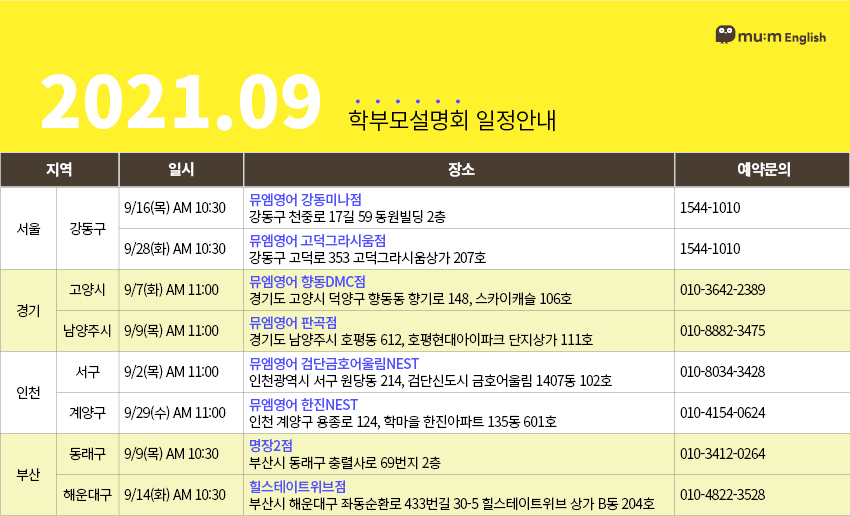| 초등영어 대표 프랜 차이즈 뮤엠영어의 21년 11월 학부모설명회 일정 (0) | 2021.10.28 |