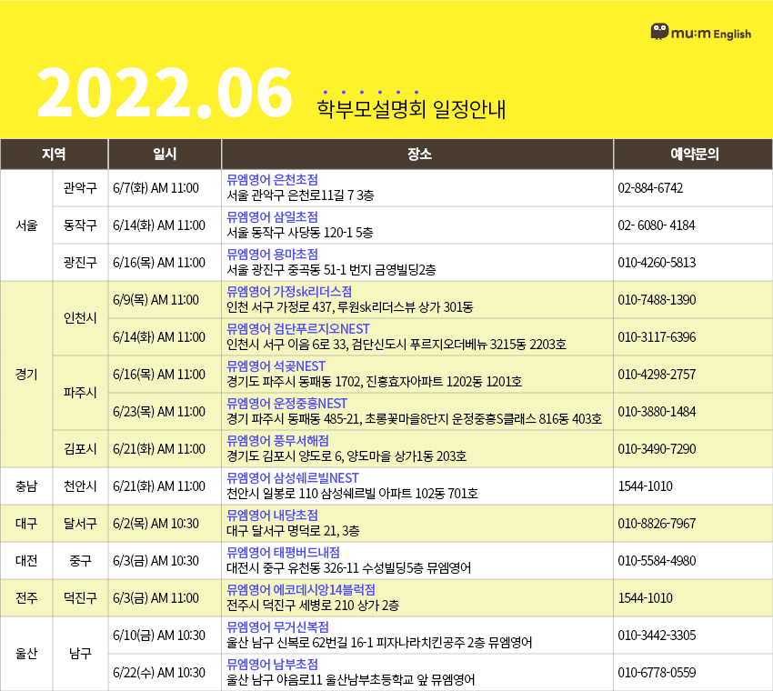 | 초등영어 대표 프랜 차이즈 뮤엠영어의 22년 7월 학부모설명회 (0) | 2022.06.28 |