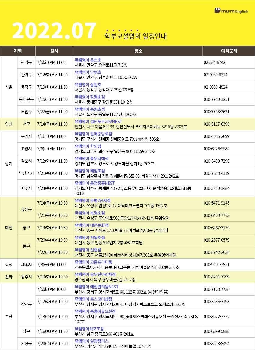 | 초등영어 대표 프랜 차이즈 뮤엠영어의 22년 7월 사업설명회 (1) | 2022.06.28 |